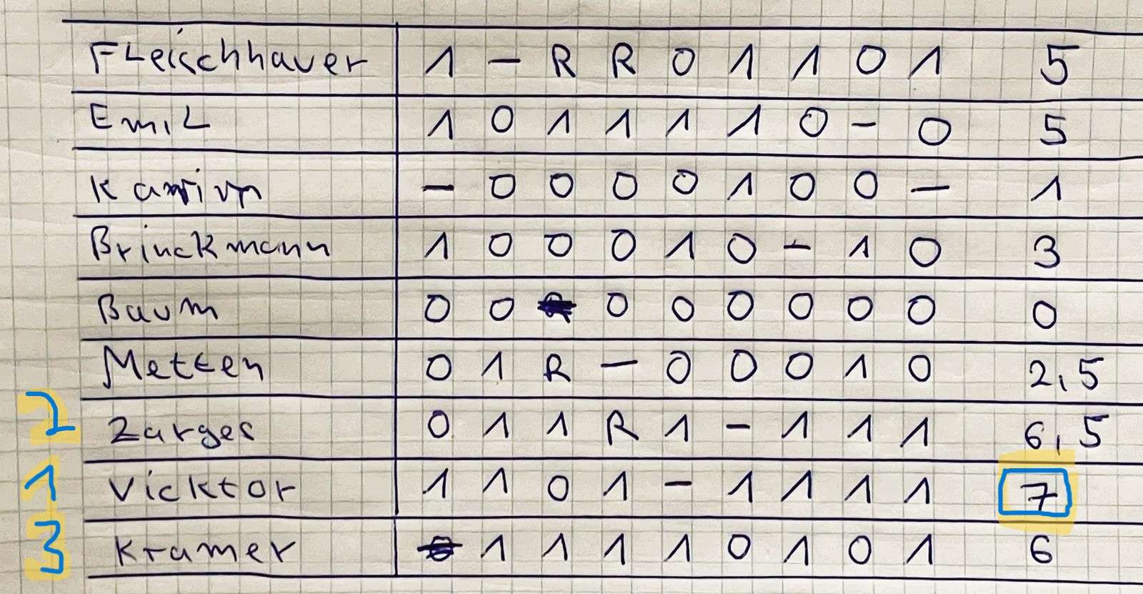 Zur dritten Runde der Vereinsblitzmeisterschaft traten neun Spieler an. Es siegte Christian Vicktor mit 7/8 P vor Stephan Zarges mit 6,5/8 P und Martin Kramer mit 6/8 P. Hier der Endstand im Überblick: