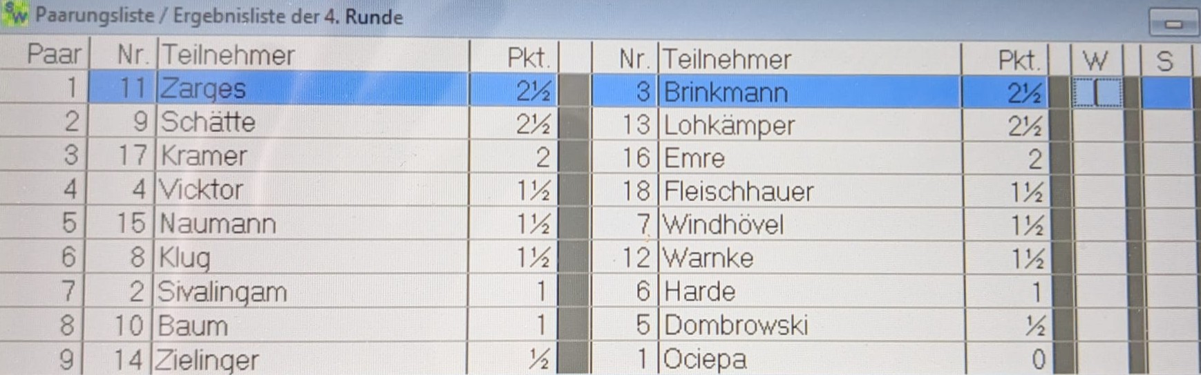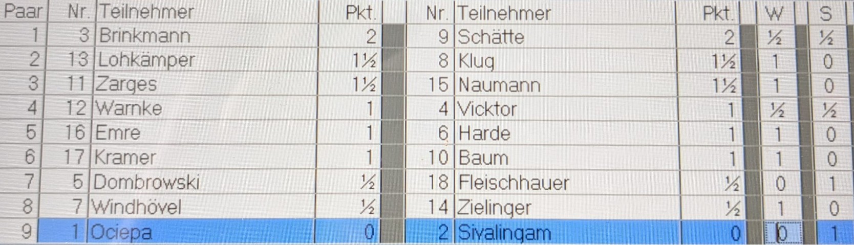 Zwei Nachholpartien aus der dritten Runde der Stadtmeisterschaft wurden am gestrigen Abend ausgetragen. In der Partie Th. Lohkämper – W. Klug setzte sich in einer tollen Offensivpartie Thomas durch und siegte! In einer weiteren Partie trennten sich D. Warnke und C. Vicktor unentschieden. Weiß hatte eine Figur für drei Bauern gegeben, wonach sich die Partie in einem dynamischen Gleichgewicht befand. Dann verschärfte sich die Partie. Nach unsauberem Spiel von beiden verdribbelte sich Didi und geriet in ein theoretisch verlorenes Endspiel: König gegen König, Läufer und Springer. Doch Schwarz trieb den König zuerst in die falsche Ecke – dann fehlten Zeit, Züge und Kraft den Fehler zu korrigieren. Insgesamt ein verdienter Partieausgang. Bis Dienstag werden auch die Ergebnisse der beiden letzten Nachholpartien Brinkmann – Schätte und Emil – Harde vorliegen.