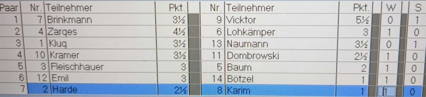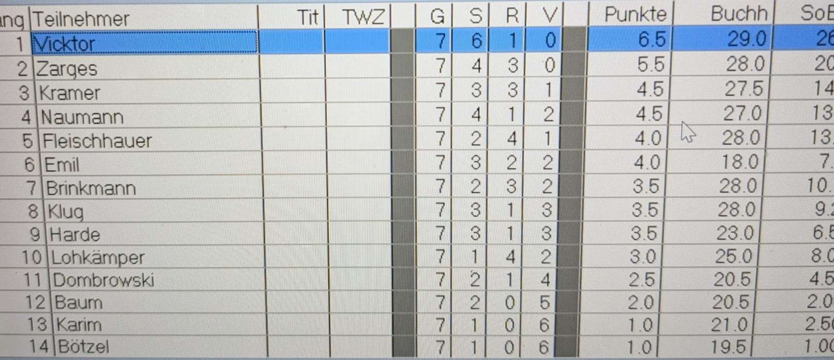 Insgesamt war es aber ein ausgekämpftes Turnier mit schönen und packenden Partien, auch in der letzten Runde. Auch die Teilnehmerzahl mit 14 Spielern passte – vielleicht geht da nächstes Jahr noch mehr! Im Folgenden werden die letzte Runde und der Endstand des Turniers dargestellt: