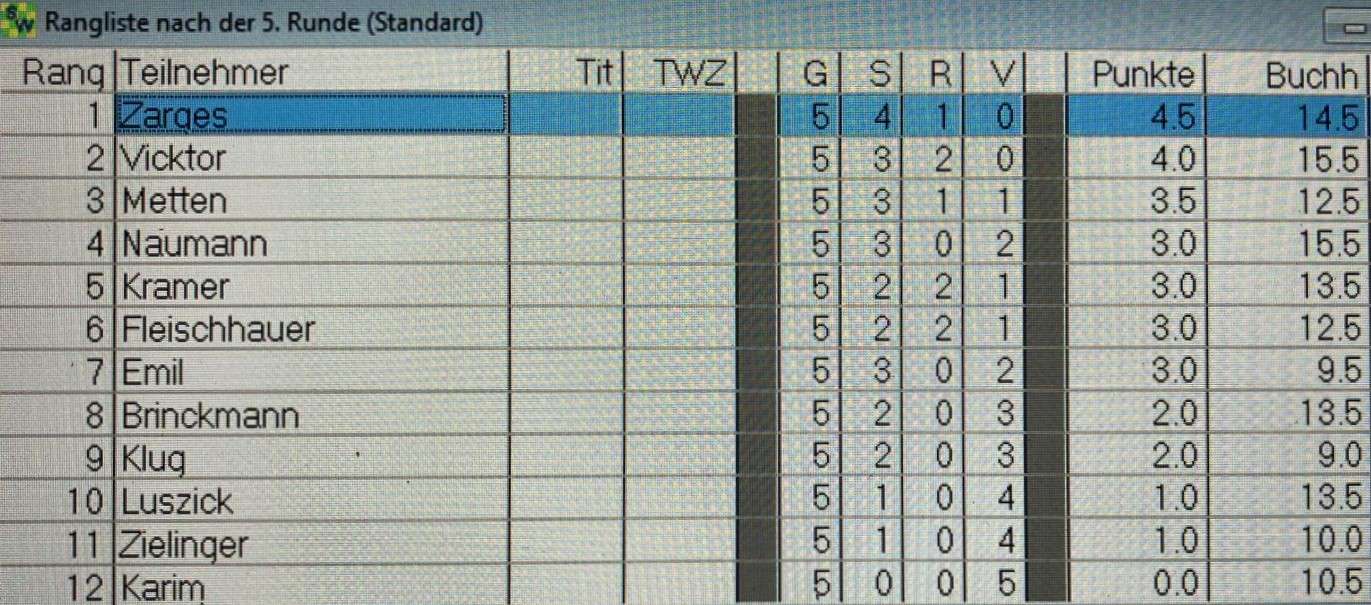 Was bedeutet das vor der letzten Runde der Vereinsschnellschach-Meisterschaft im Dezember? In der Gesamtwertung, in die maximal (die besten) acht Runden eingehen, sieht es so aus: