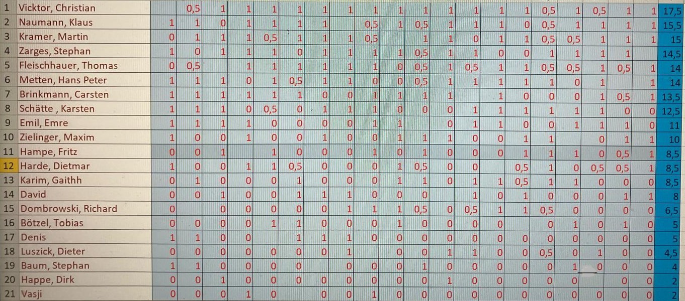 Die wohl seit Jahrzehnten größte Teilnehmerzahl hatten die Schachfreunde Schwerte bei ihrem traditionellen vereinsinternen Ostereier-Blitzturnier. 21 Spieler – darunter einige Bekannte als besondere Gäste – kämpften um die 300 Eier, die der Materialwart und Spielleiter Thomas Fleischhauer gelegt, pardon besorgt hatte… Geschicktester Eierdieb war ungeschlagen Christian Vicktor mit 17,5 P vor Klaus Naumann als Zweitem (15,5 P) und Martin Kramer (15 P) als Drittplatziertem. Die Tabelle: