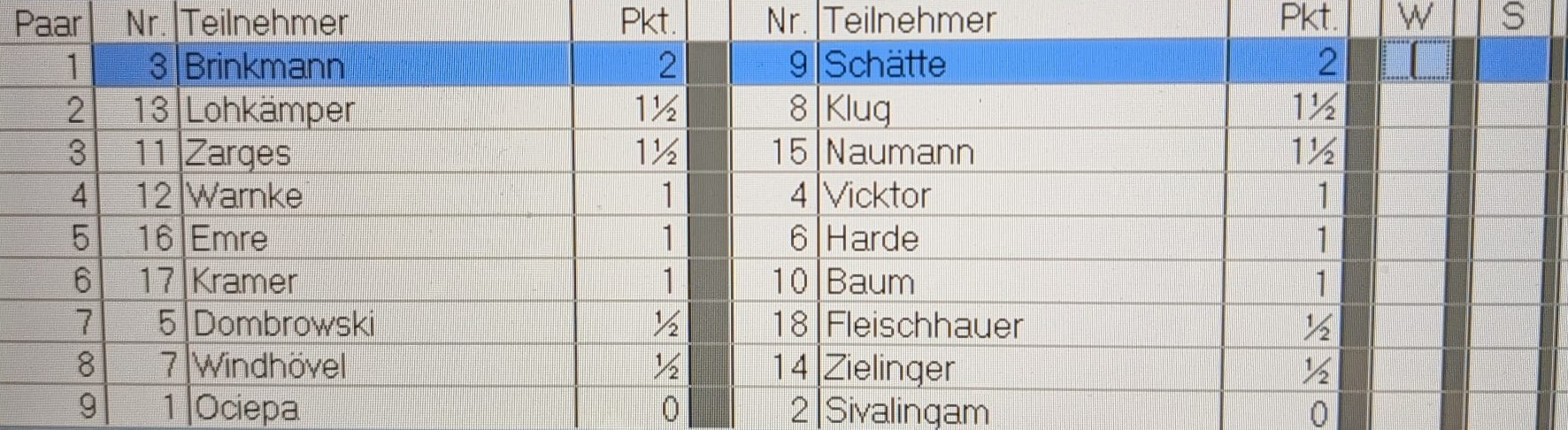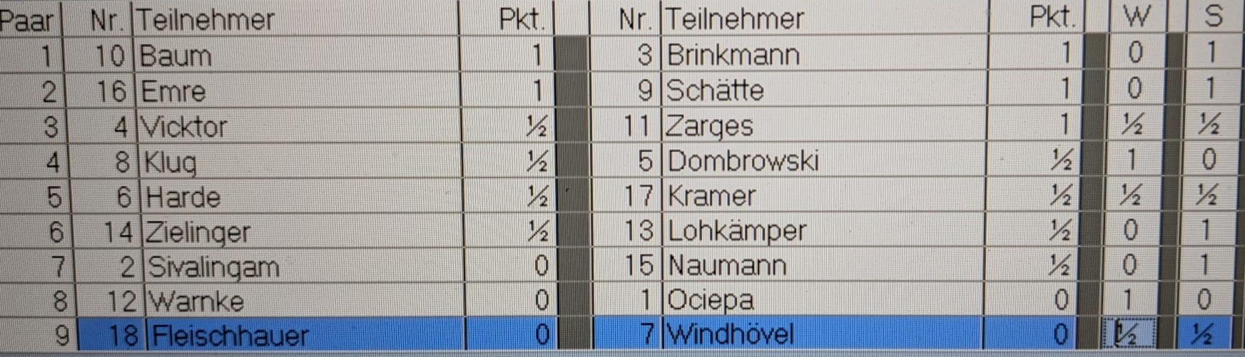Mit den schwarzen Steinen setzte sich in einer interessanten Begegnung Karsten Schätte gegen Emre Emil durch, während nach Absprache Thomas Lohkämper kampflos einen ganzen Punkt gegen Maxime Zielinger bekam.