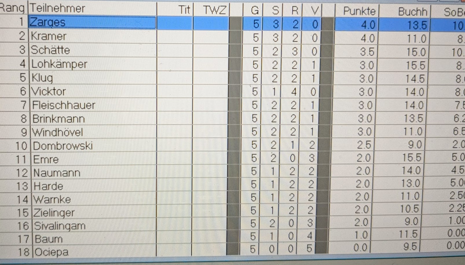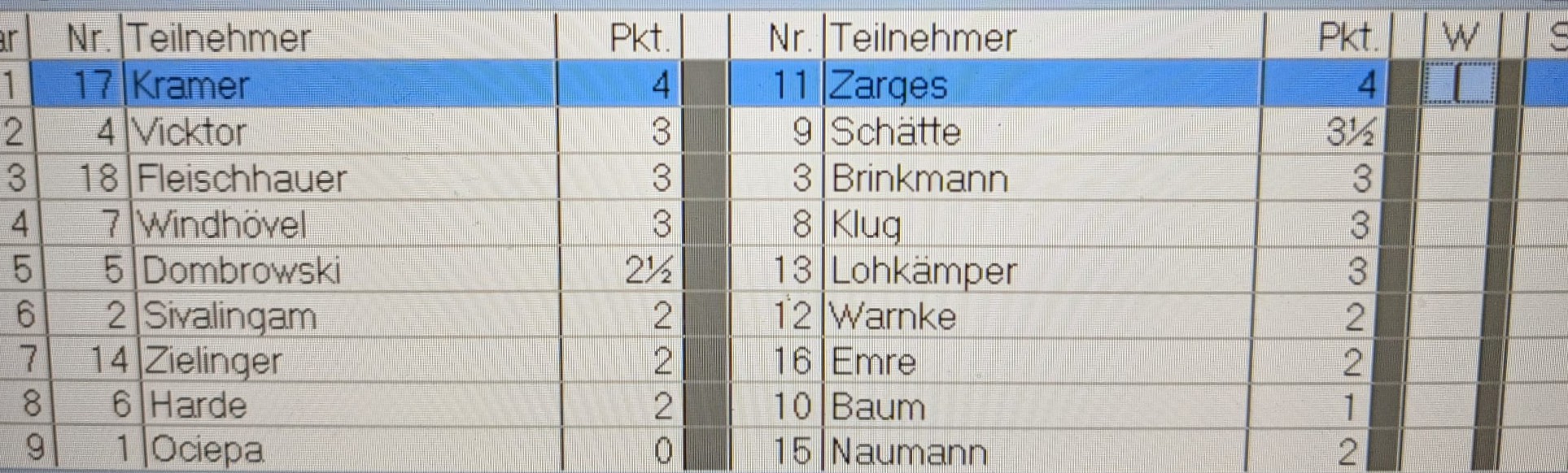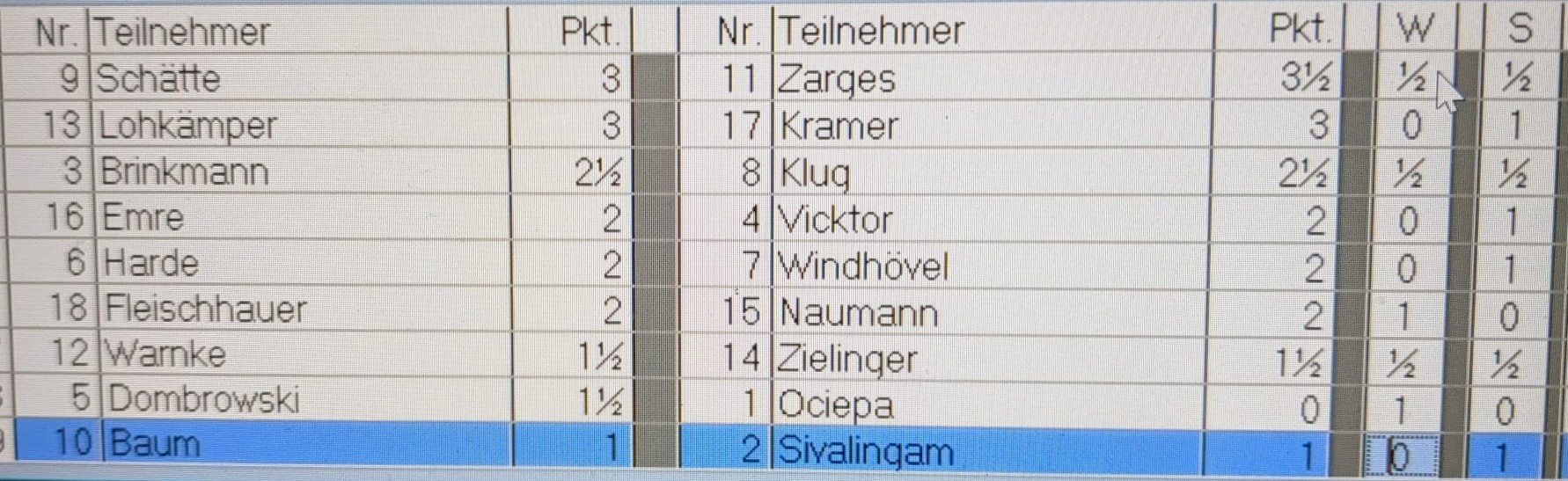 Tabellenführer Stephan Zarges spielte Remis gegen Karsten Schätte, Thomas Fleischhauer setzte sich gegen Klaus Naumann durch. Hier die Ergebnisse der Runde 5 im Überblick: