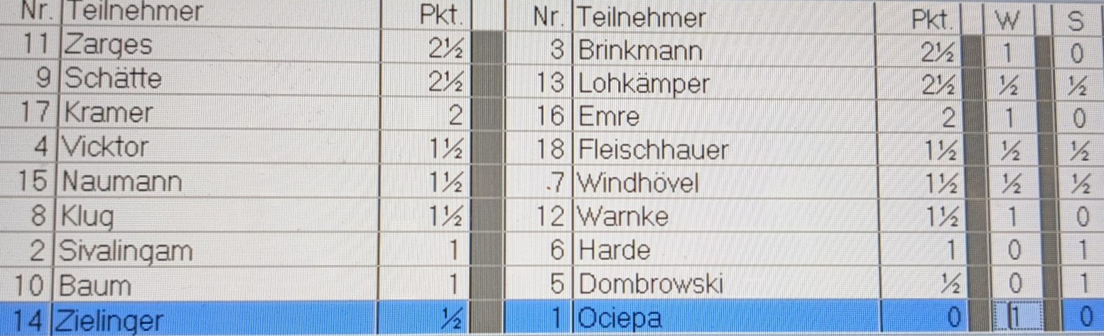 In den zwei Nachholpartien der vierten Runde der Stadtmeisterschaft im Normalschach setzte sich Stephan Zarges gegen Carsten Brinkmann durch, während die Partie zwischen Karsten Schätte und Thomas Lohkämper unentschieden endete.