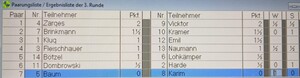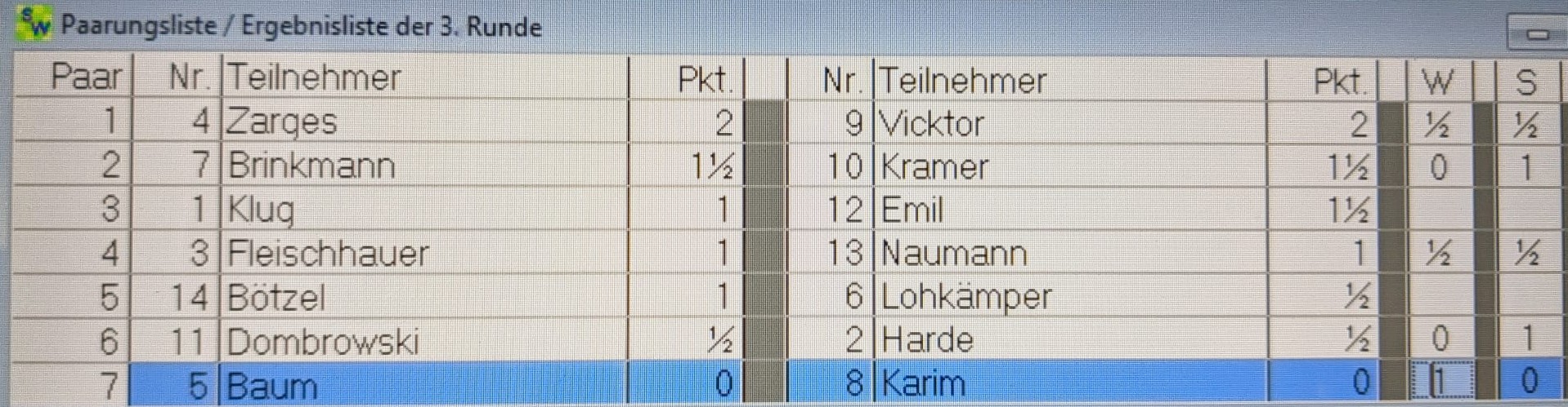 Schwarz stand mittlerweile objektiv auf Verlust, beschäftigte Weiß aber weiterhin mit unangenehmen Zügen. Weiß rettete sich in schwer zu spielender Zeitnot über die Zeitkontrolle – nur um dann (Wirtshausschlägerei halt) nach einem Lucky Punch auch aufs Brett zu gehen: Schwarz konnte ins Remis abwickeln…Puuh.. In den anderen Partien ging es strategischer und positioneller zu: Dietmar Harde setzte sich gegen den unermüdlichen Richard Dombrowski nach gutem Positionsschach durch wie auch Stephan Baum gegen den jungen Gaith Karim. Die Partie zwischen Thomas Fleischhauer und Klaus Naumann endete remis. Die Partien im Überblick: