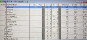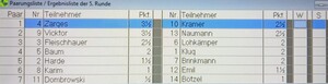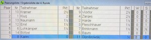 Von den sieben Partien wurden dabei sechs entschieden – wobei zwei Begegnungen (nach Absprache und Regularium) kampflos entschieden wurden (Naumann – Harde und Bötzel – Baum). Am längsten dauerte die Partie zwischen Martin Kramer und Christian Vicktor, der sich in der Zeitnotphase durchsetzen konnte. Hier der Ergebnisüberblick zur Runde 4: