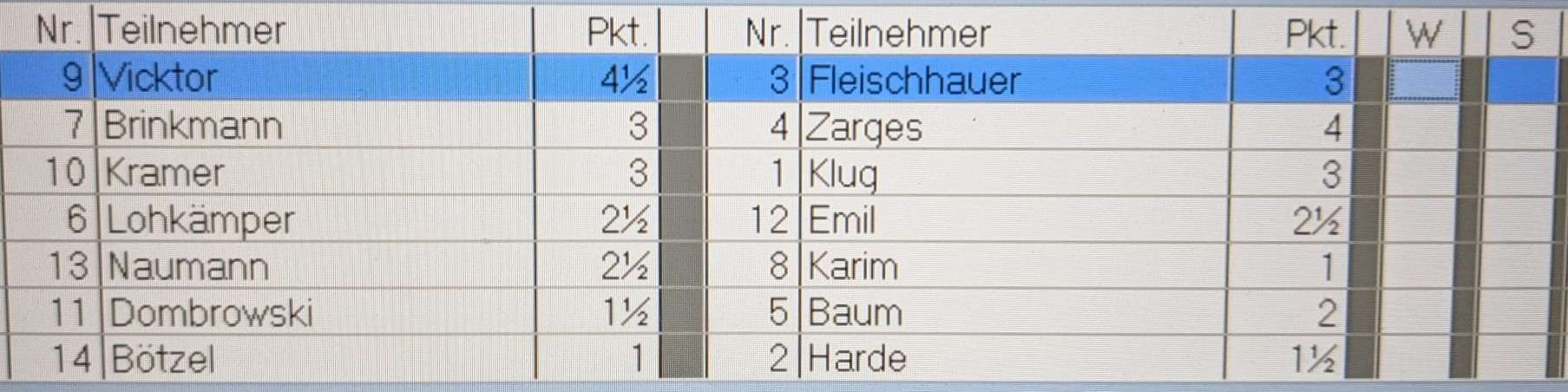 Mit diesem Rundenausgang sicherte sich Christian Vicktor den Gesamtsieg der Blitz-Vereinsmeisterschaft 2025 – er gewann (geteilt) drei von vier Runden. Knapp dahinter landete auf Platz zwei Stephan Zarges, Dritter wurde Martin Kramer. Allen Dreien herzlichen Glückwunsch! Hier der Endstand: