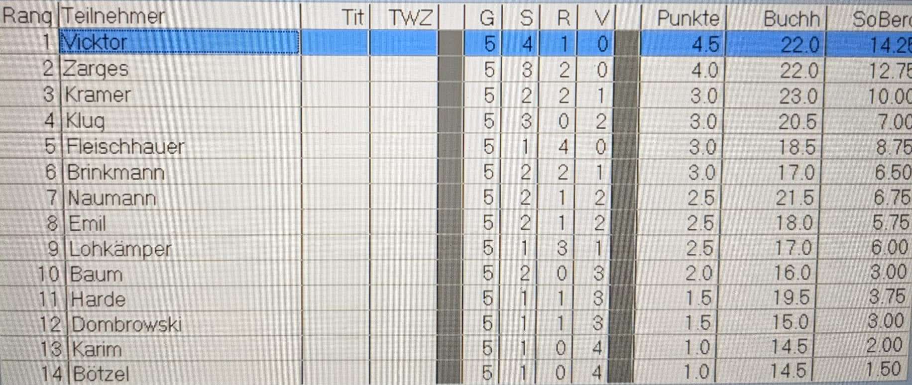 Abgeschlossen wurde zudem die fünfte Runde der klassischen Vereinsmeisterschaft. In einer Nachholpartie siegte Wolfgang Klug mit den schwarzen Steinen gegen Stefan Baum. Alle Ergebnisse der Runde 5 im Überblick: