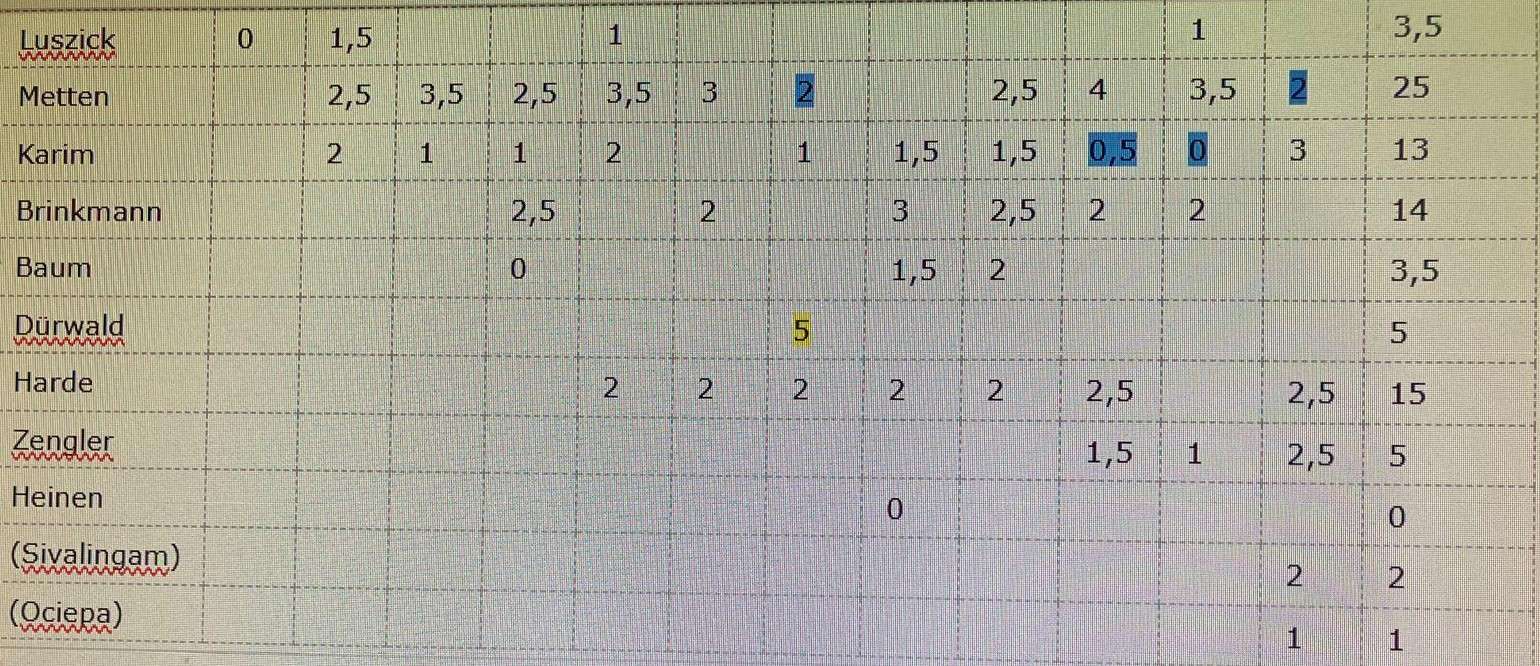Elf Teilnehmer hatte die Dezember-Runde der Vereinsschnellschach-Meisterschaft 2025. Klarer Sieger wurde Christian Vicktor (4,5/5 P) vor Martin Kramer (3,5 P) und Thomas Fleischhauer (3 P). Hier die Tabelle: