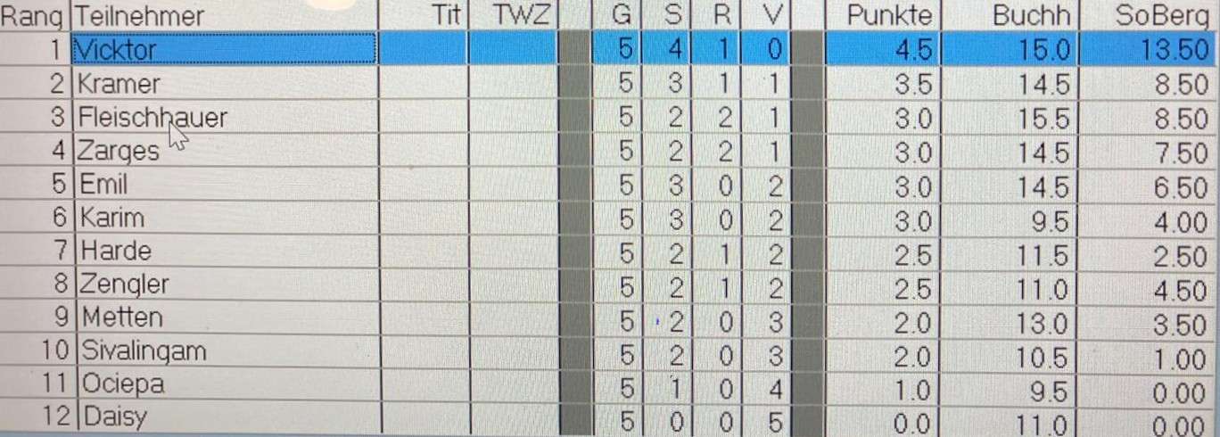 Elf Teilnehmer hatte die Dezember-Runde der Vereinsschnellschach-Meisterschaft 2025. Klarer Sieger wurde Christian Vicktor (4,5/5 P) vor Martin Kramer (3,5 P) und Thomas Fleischhauer (3 P). Hier die Tabelle: