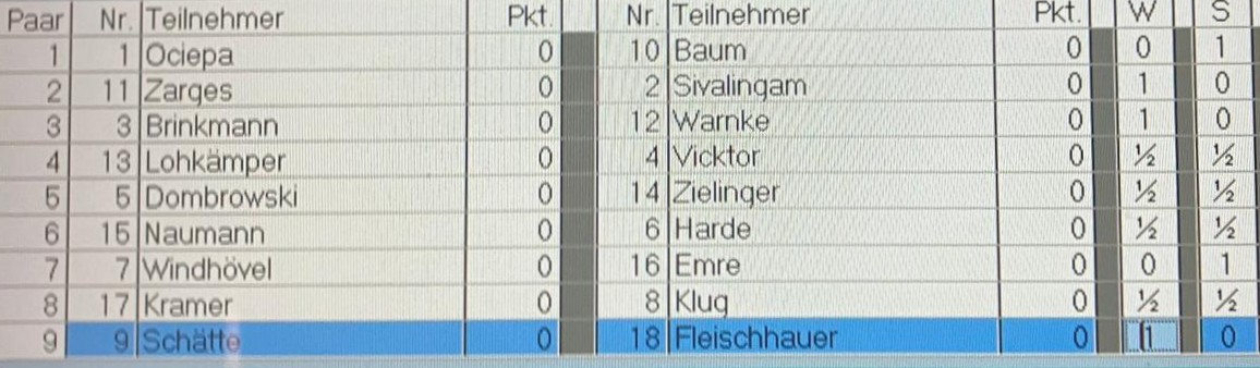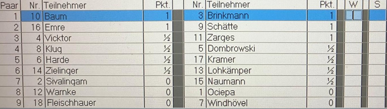 In einer Nachholpartie der ersten Runde der klassischen Stadtmeisterschaft setzte sich Carsten Brinkmann gegen Didi Warnke durch. Damit ging die erste Runde wie folgt aus: