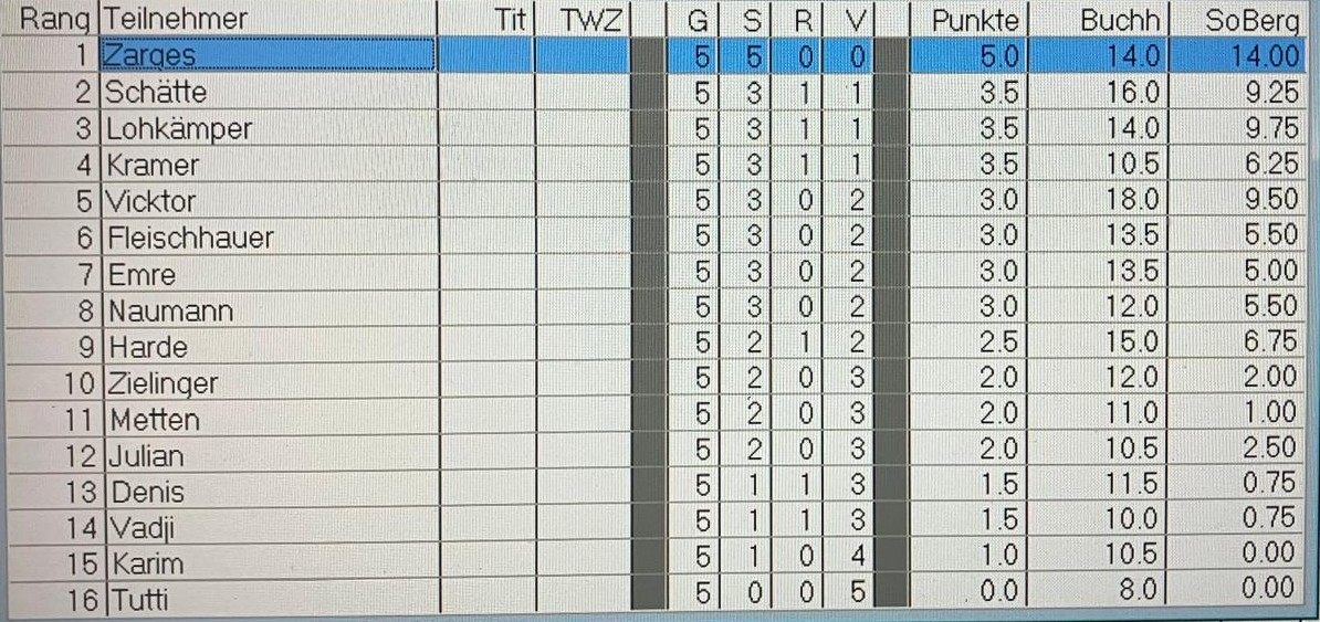 In der Februarrunde der Vereinsschnellschach-Meisterschaft gab es mit Stephan Zarges einen Sieger mit blütenweißer Weste: 5/5 Punkte – herzlichen Glückwunsch! Es folgten auf den weiteren Plätzen Karsten Schätte, Thomas Lohkämper und Martin Kramer mit 3,5 Punkten. Hier ist der Endstand im Überblick: