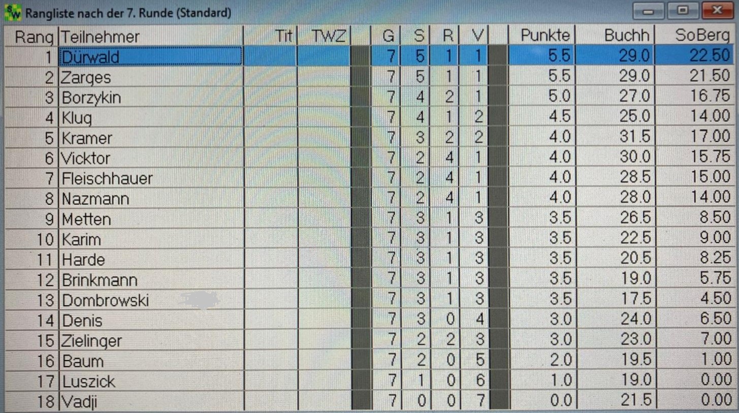 Nun zum Turnier selbst. Sieger, nur durch eine leicht bessere zweite Feinwertung vom Zweiten getrennt, wurde Martin Dürwald mit 5,5 Punkten aus sieben Partien. Es folgten Stephan Zarges (ebenso 5,5/7 P) als Zweit- und Ihor Borzykin (5/7 P) als Drittplatzierter – allen Dreien einen herzlichen Glückwunsch!