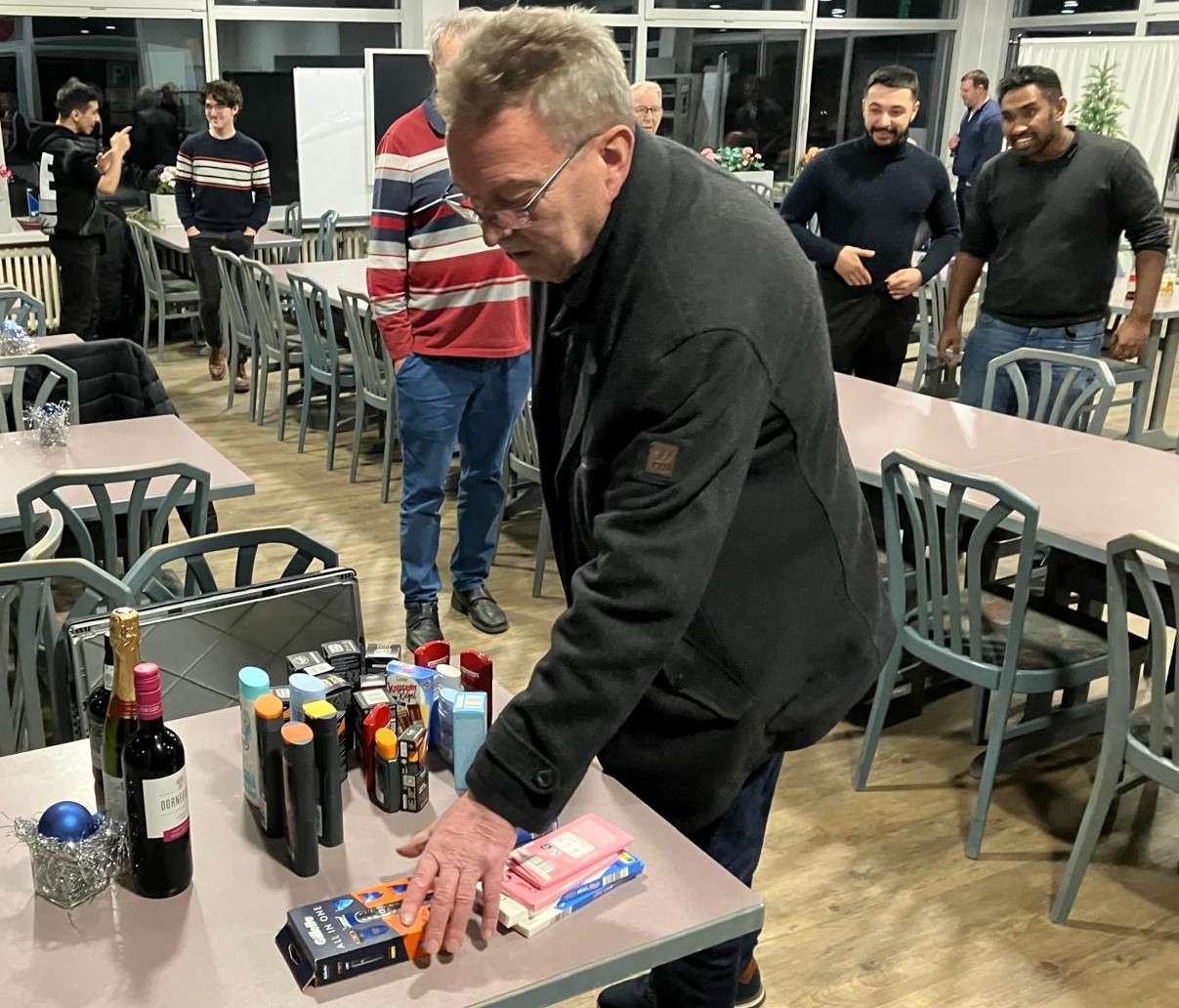 Tolle 18 Teilnehmer hatte die Weihnachtsfeier der Schachfreunde Schwerte am gestrigen Abend, die traditionell wieder in Form eines Schnellschach-Turniers ausgetragen wurde. Als Siegprämien gab es kleine Geschenke für alle – Süßigkeiten, ein paar gute Tropfen und kleine, praktische Artikel für den Alltag. Es ist so schön, dass unser Verein in den letzten Monaten so viele nette und begabte Schachfreunde dazugewonnen hat! Klasse!